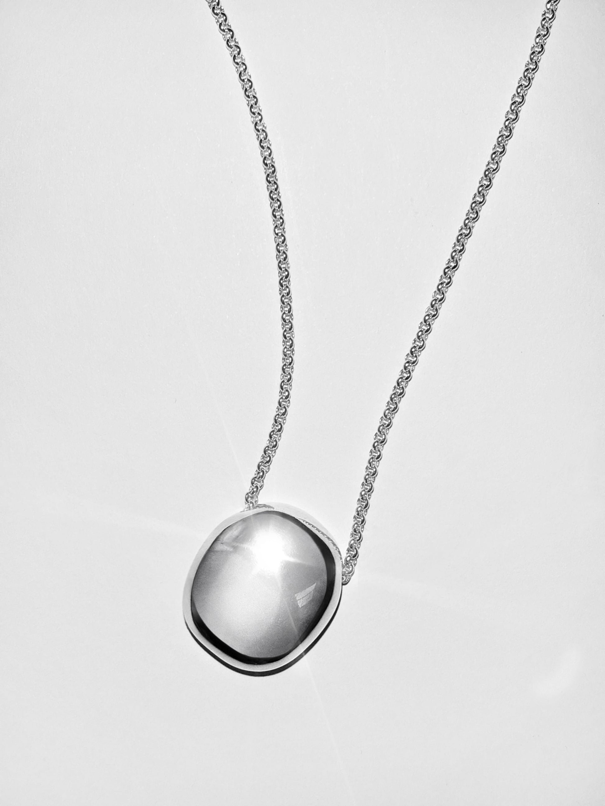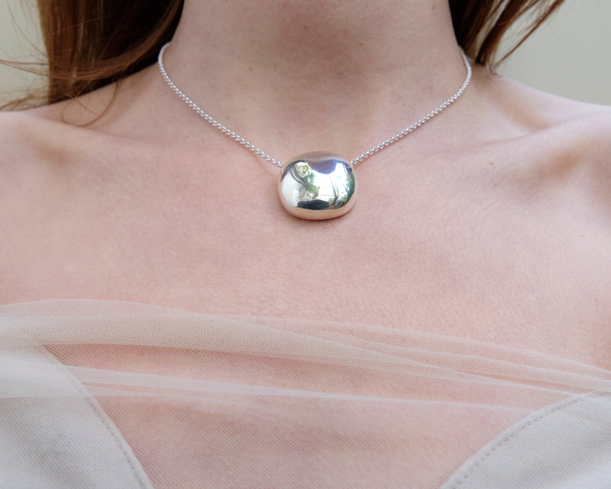 Its minimalist design and smooth, polished surface gently catch the light. The generous volume, achieved through the electroforming technique, beautifully contrasts with its lightweight feel when worn.