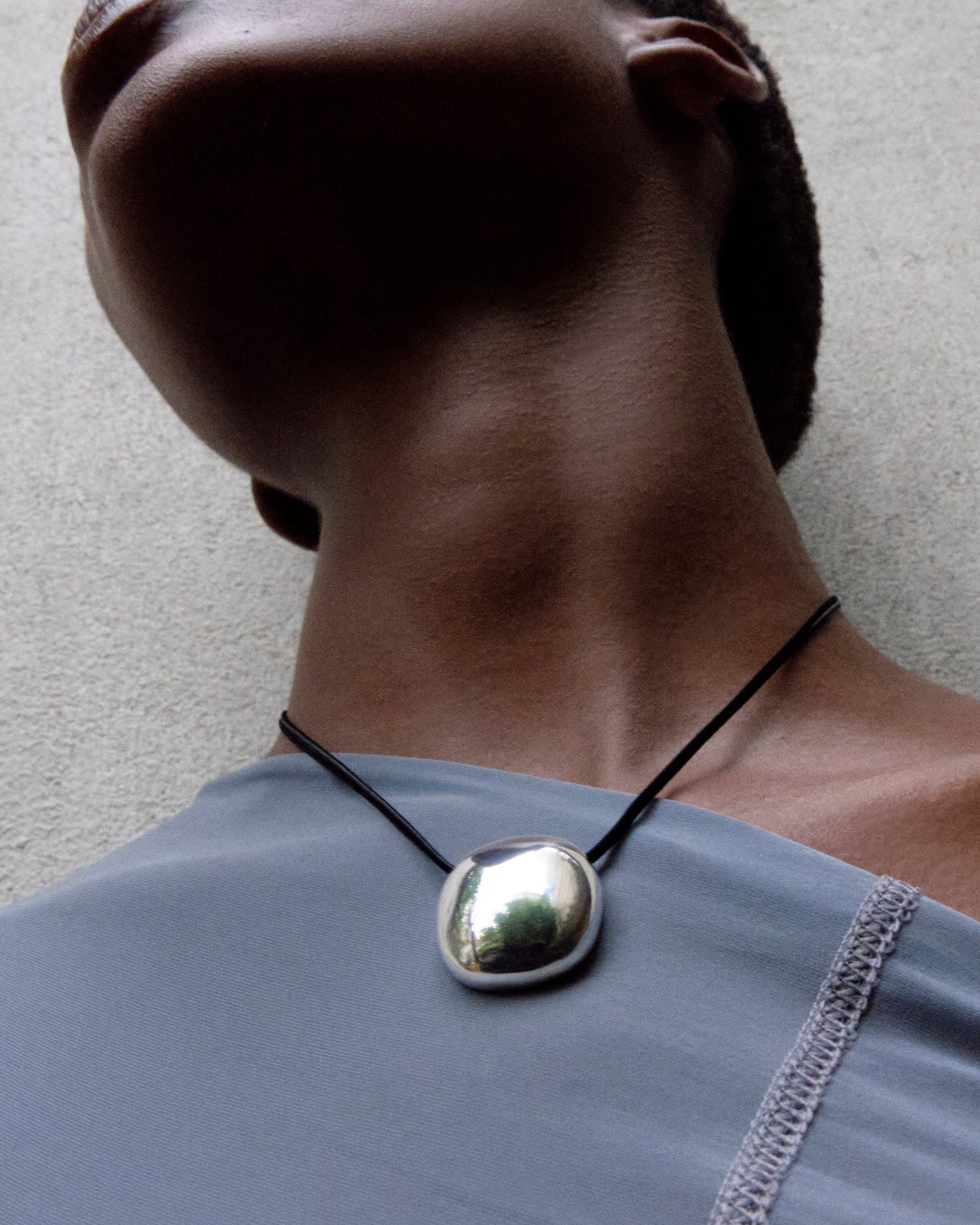 The pendant, sculpted in volume using the electroforming technique, combines a bold, sculptural presence with a lightweight feel when worn.