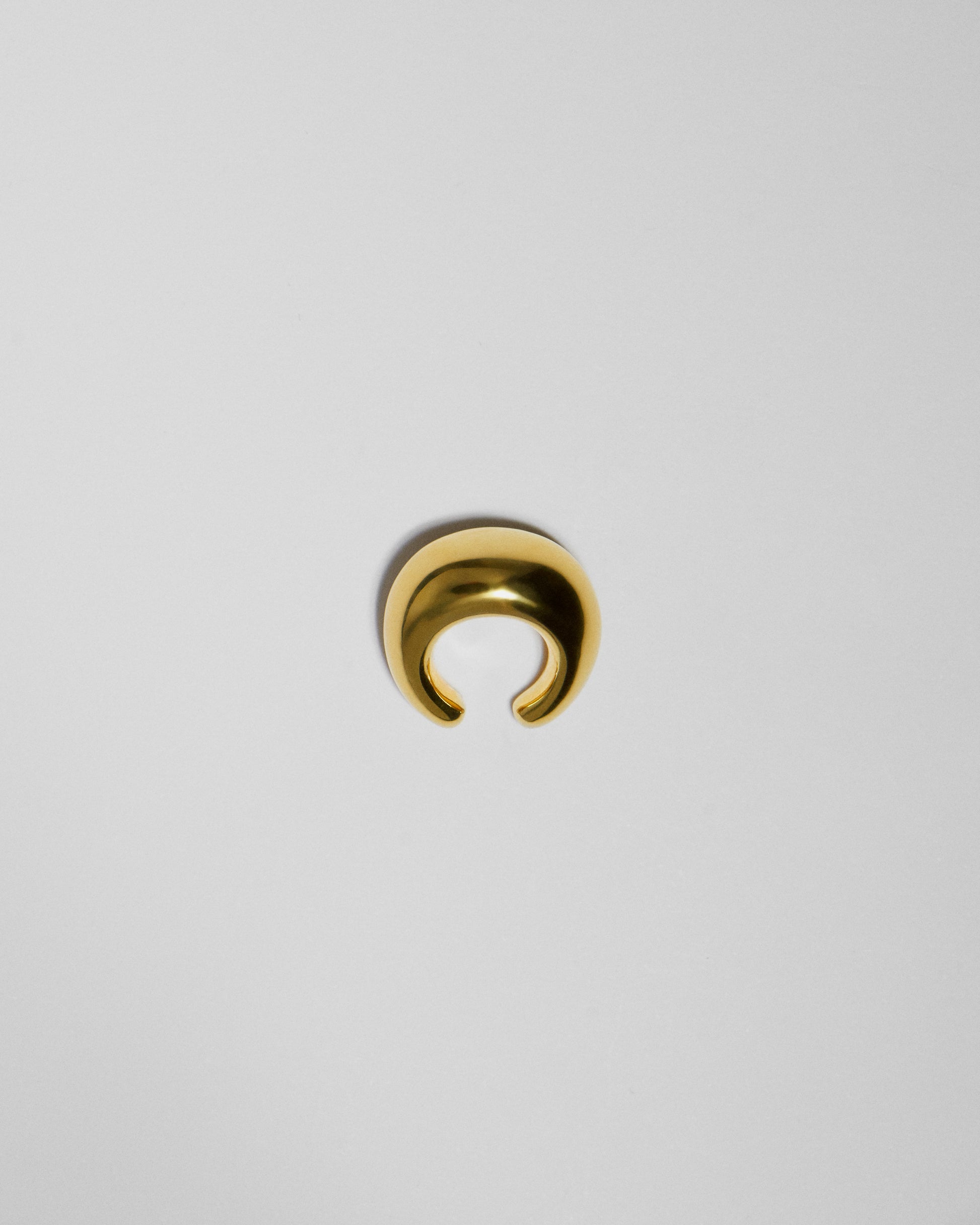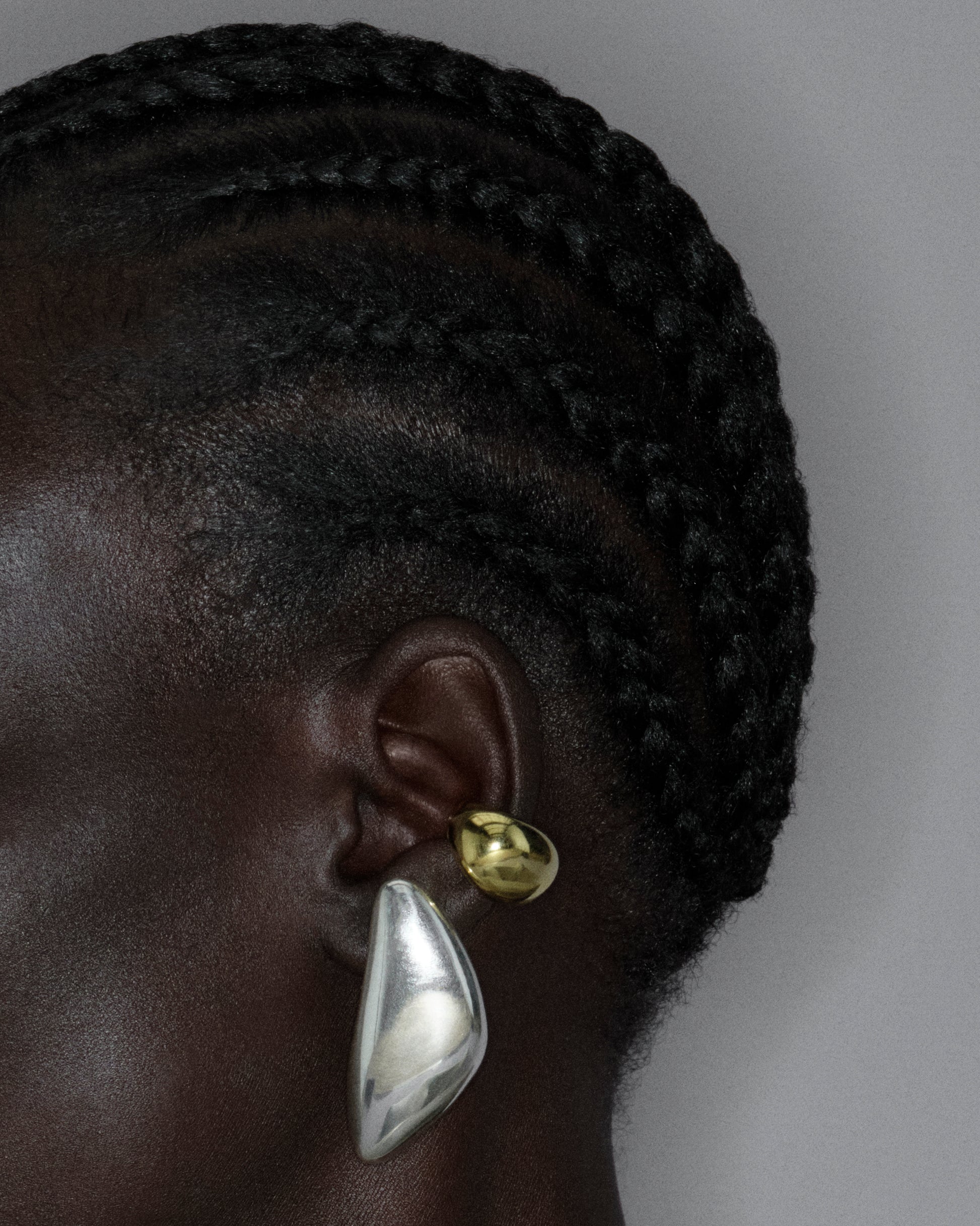 Modèle sans perçage qui s’adapte au contour de l’oreille comme un bijou de peau. Sa silhouette arrondie et sa surface lisse captent la lumière avec justesse. Volumineuse sans être lourde, elle doit sa légèreté à la technique d’électroformage.