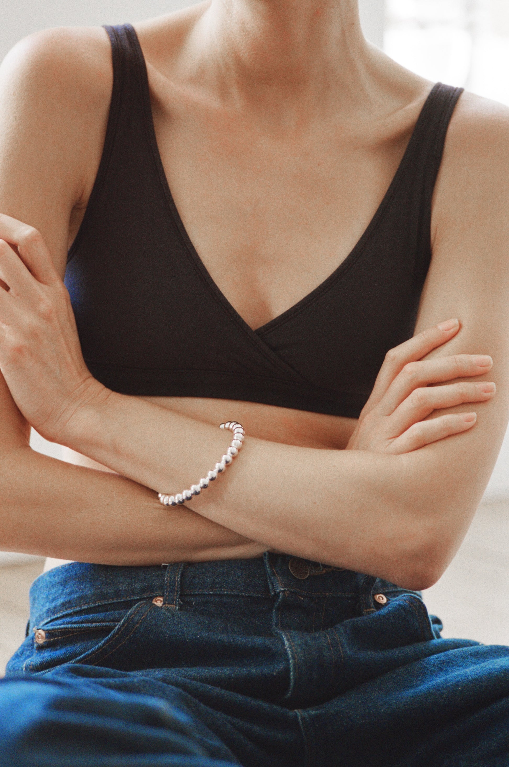 Bracelet rigide au design épuré, le modèle Pippa se distingue par ses perles en argent 925 à la surface lisse et brillante. Grâce à la technique d’électroformage, elles offrent un volume généreux tout en restant légères au porté.