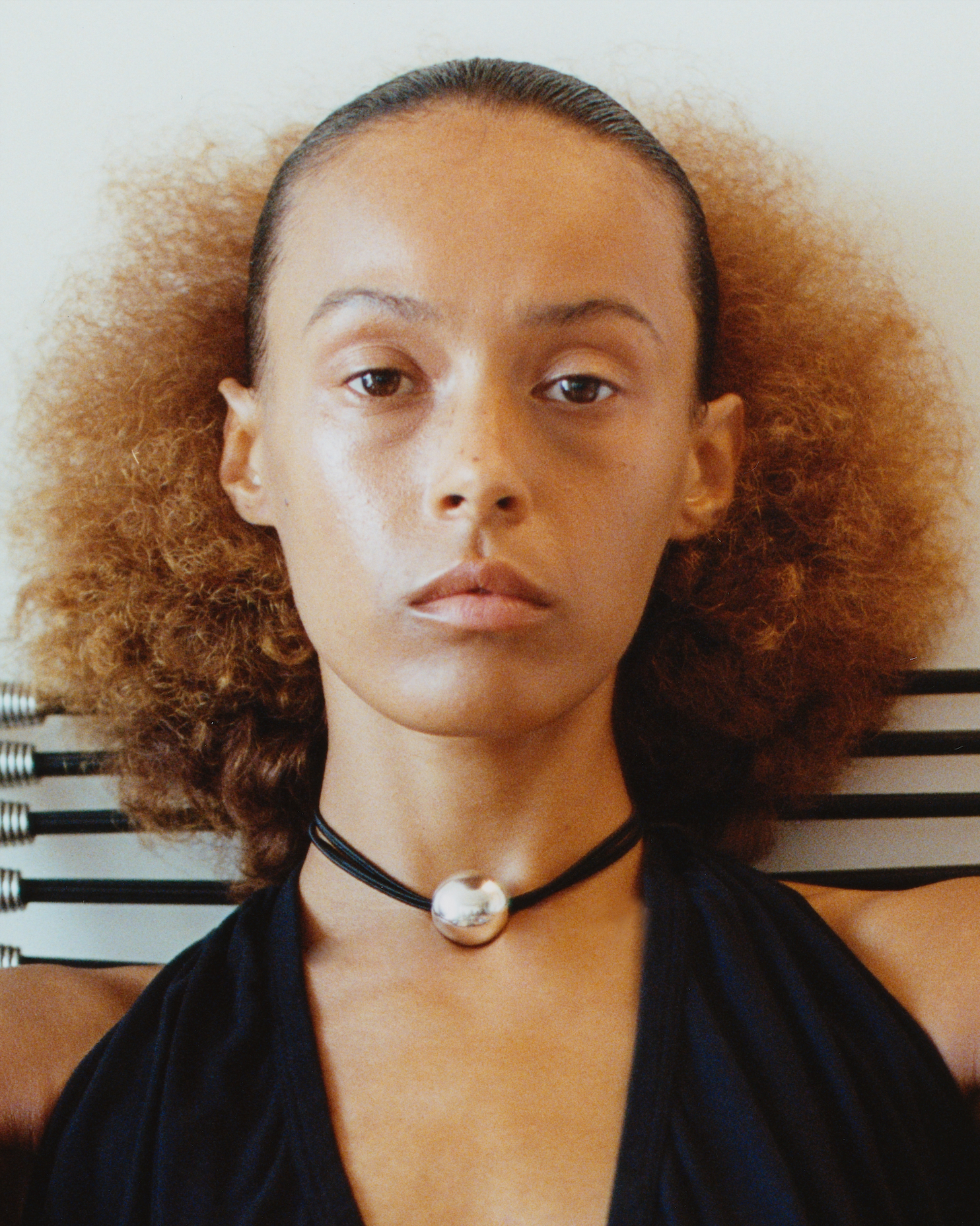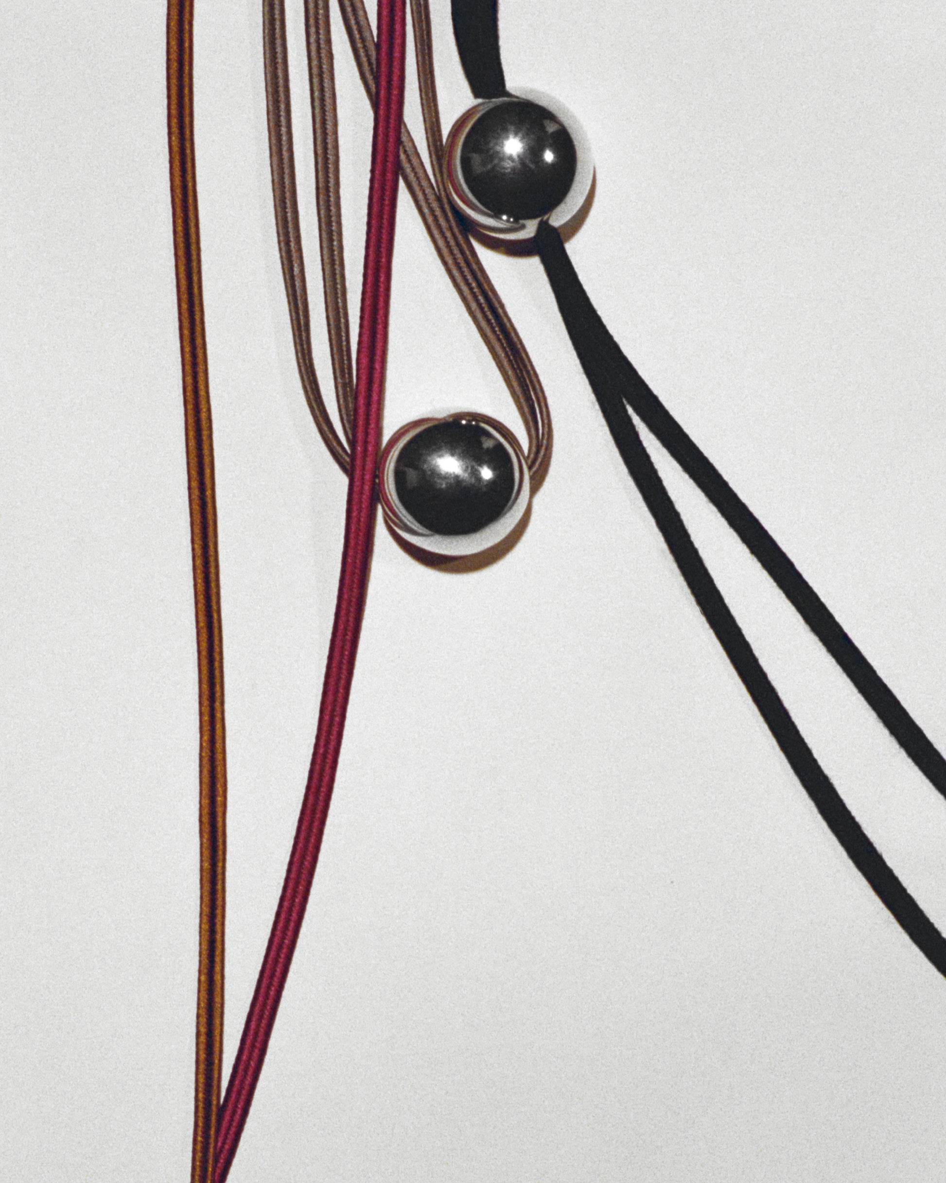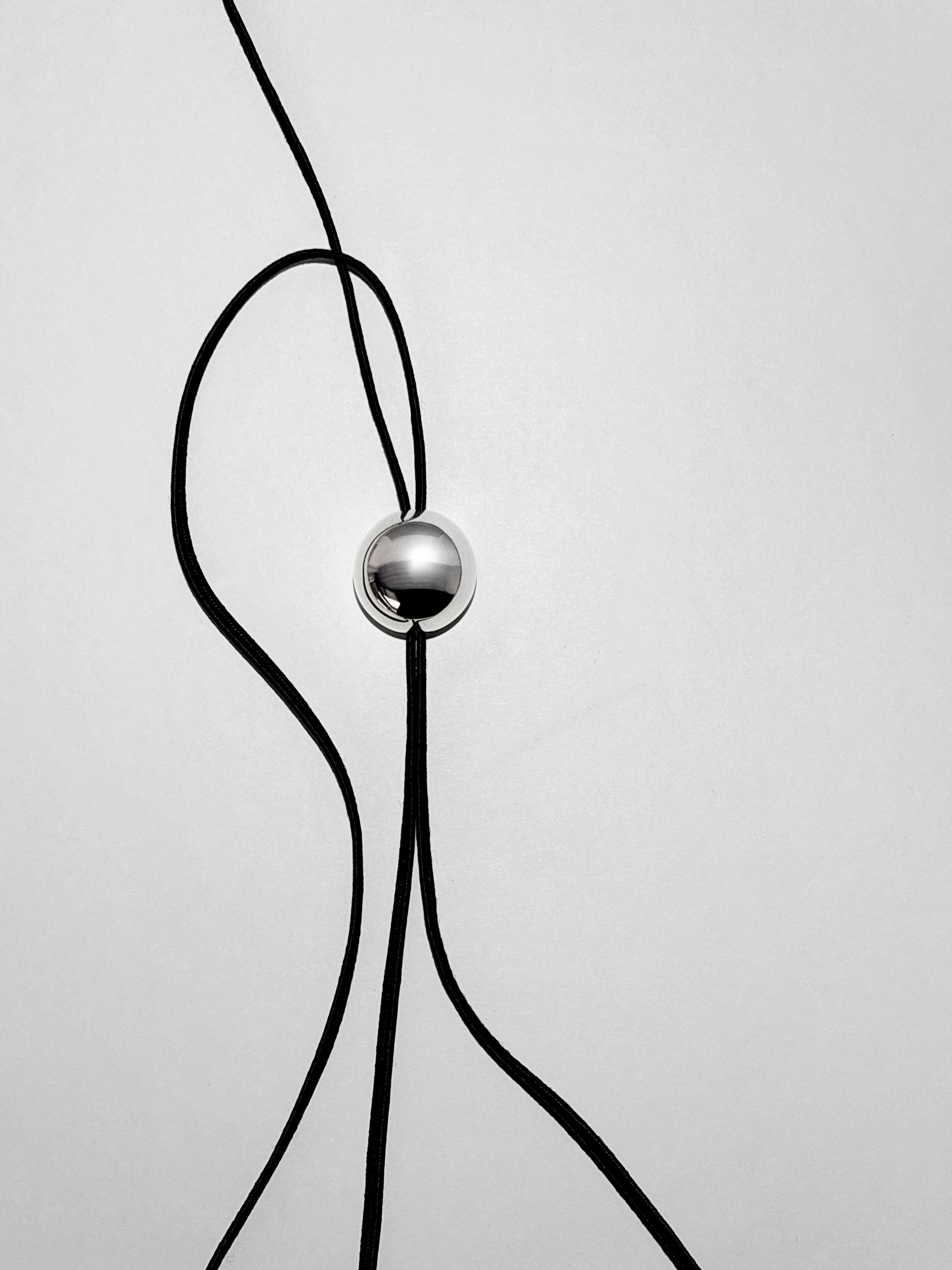 Monté sur un cordon de soie gris, il se noue au creux du cou avec souplesse et sobriété.